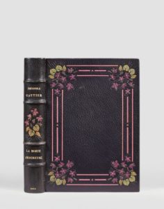 GAUTIER (Théophile). La Morte Amoureuse. Compositions de P.-A. Laurens, gravées en couleurs par Eugène Decisy. P., Romagnol, 1904. In-4, maroq. violet, dos à 4 nerfs avec motif mosaïq. de branches, fleurs et feuillages, plats encadrés d’un large décor mosaïq. de listels et violettes, large bande intér. de maroq. avec fil. or et violettes mosaïq. aux angles, gardes moire, doubles gardes, couv. et dos cons. (Lanoë).