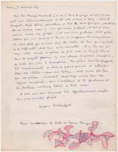 Avec "Lili", Dubuffet sort d’une grippe interminable qui l’a retardé dans sa correspondance ; (…) Ne vous faites pas de souci pour la statue, dès lors que représente de la difficulté, choisissez m’en une autre. Il a bien reçu son recueil de poèmes en deux exemplaires ; Vos poèmes sont très frappants, très impressionnants et doués de grand pouvoir et autorité. Mais vos statues - dans mon optique - vont encore plus loin que vos poèmes, s’avancent davantage encore dans des régions inexplorées, dans l’arbitraire et les fantasmes et les châteaux mentaux libérés de toute raison (…). Dubuffet termine sa lettre avec un dessin à rayures rouges et bleues.