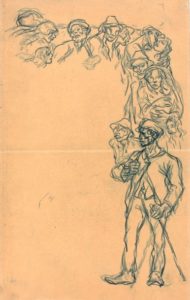 sauf quatre, sur vélin au crayon Conté gras. Ces dessins ont servi à illustrer : le faux-titre de «Gueux des Champs», «du cidre il faut», «les vrais gueux», «les vieux papillons», «le bouc aux enfants», «sonnet bigorne», le faux-titre de «Gueux de Paris», «le marchand de coco», «à mon ami sans nom», «pas frileux», «chanson des cloches de baptême», «ballade de Joyeuse vie», «fleurs de boisson», «remède féroce», «le vin triste», «pâle et blonde», «Polichinelle », «Bout de Spleen», «cimetière intime», «sonnet morne», «à Maurice Bouchet», «Ballade Villon», «Ballade Ponchon», etc…
