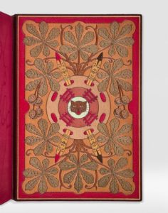 WILLETTE (Adolphe). OEuvres choisies, contenant 100 dessins choisis dans le Courrier Français de 1884 à 1901. Préface illustrée de l’auteur. P., Simonis Empis, 1901. Gr. in-8, maroq. grenat, composition mosaïquée au dos représentant un chat debout, de profil, doubl. de maroq. rouge décoré d’une superbe composition mosaïquée avec tête de chat au centre, dans un cercle avec ailes de Moulin, crayons surmontés de têtes de clowns, branches et feuillages de marronniers en fleurs, gardes de moire grenat, double gardes, tr. dor. sur témoins, double couv. illustr. et dos cons. (Ch. Meunier, 1904).