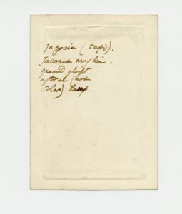 Baudelaire (Charles). Notes autographes [adressées à Edouard Laumonier]. [Paris, 1863]. 5 lignes, en anglais et en français, au verso d'une carte de visite gravée imitant sa signature, sur bristol de format 8 x 11 cm. 1.000/1.500