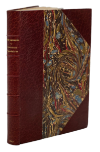 Paris, Librairie de la Revue indépendante, 1887. In-12, demi-maroquin brun avec coins, tête dorée, non rogné, couverture et dos (Devauchelle).Édition originale de ce recueil de nouvelles parodiques, publiée par les soins d'Édouard Dujardin quelques semaines après la disparition de l'auteur.
