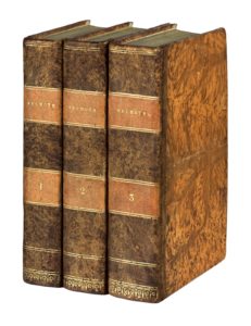 Paris, G. C. Hubert, 1821. 6 tomes en 3 volumes in-12, demi-basane racinée, dos lisse orné de filets dorés, pièces de titre et de tomaison roses, tranches jaunes mouchetées (Reliure de l'époque).Édition originale française, de toute rareté, d’une des œuvres les plus représentatives du roman gothique, traduite par Jean Cohen sur l’originale anglaise de 1820.