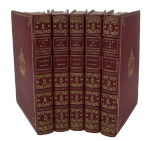 Paris, Alphonse Lemerre, 1883-1898. 5 volumes in-8, maroquin rouge, triple filet doré, fleurons aux angles, armoiries au centre, dos orné, triple filet intérieur, double gardes, tête dorée, non rogné (Gruel).Première édition collective, réunissant les œuvres poétiques publiées entre 1865 et 1888 dans les quatre premiers volumes et L'Expression dans les beaux-arts, un essai de 1883, dans le cinquième.