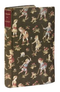 Paris, Léon Vanier, 1888. In-12, bradel cartonnage recouvert de tissu olive imprimé de motifs en couleurs figurant des jeux d’enfants, pièce de titre rouge, à toutes marges, couverture (Féchoz).Édition originale.