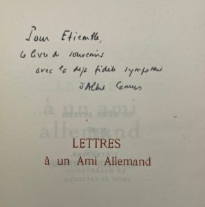 Envoi autographe signé de Camus à René Etiemble : Pour Etiemble, ce livre de souvenirs avec la déjà fidèle sympathie d’Albert Camus.