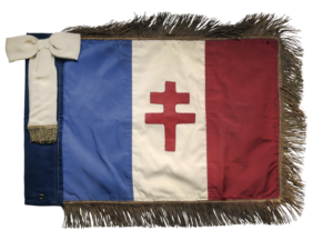 Fanion (50 x 37 cm) en tissu bleu-blanc-rouge avec la croix de Lorraine rouge cousue sur le tout, bordé d'un gallon à franges doré sur trois côtés et d'un fourreau de toile bleue sur le quatrième côté et agrémenté d'un grand neuf d'étoffe blanche garni du même gallon. Pièce encadrée sous verre (69 x 57 cm). Ces fanions tricolores ornaient la Simca Présidence du Général de Gaulle.