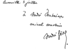 Envoi autographe signé d'André Gide à André Fontainas (1865-1948), poète et critique belge qui tint la rubrique poésie du Mercure de France durant de très nombreuses années, assurant un lien entre les symbolistes belges et français.