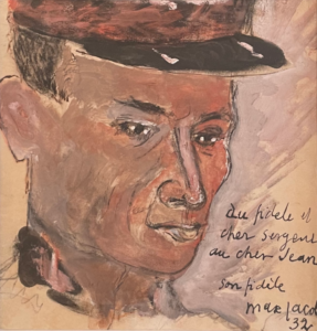 Envoi autographe signé de Max Jacob, en bas à droite du dessin, à l'encre noire : Au fidèle et cher sergent, au cher Jean, son fidèle Max Jacob. 32.