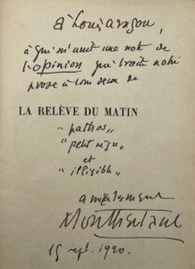 Précieux exemplaire offert par Montherlant à Aragon, avec cet affectueux envoi autographe signé : à Louis Aragon, à qui m'unit une note de L'Opinion qui traite notre prose à tous deux de "pathos", "petit nègre" et "illisible", amicalement, Montherlant, 15 sept. 1920.