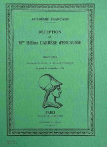 On joint 5 autres fascicules contenant le Discours sur la vertu de Michel Déon (1999), l’hommage posthume à Jacques Laurent prononcé par Hector Bianciotti (2001), avec dactylographie corrigée, et les discours de réception d’Hélène Carrère d’Encausse (1991), de Federico Zeri (1999) et de Jeanne Moreau (2001).