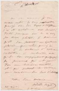 Avec quelque retard, Adèle Hugo envoie à l’ami de son mari deux portraits ; (…) J’ai été malade le mois dernier ; voilà pourquoi vous ne les avez pas reçus plutôt. Je désire qu’ils vous fassent un égal plaisir que celui que j’ai eu à les dessiner à votre intention. Je souhaite aussi qu’ils vous rappellent quelquefois des personnes qui ont pour vous une sincère amitié et qui mettent la vôtre au nombre de leurs richesses (…).