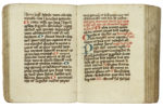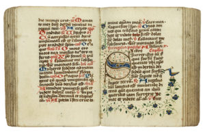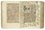 234 ff., sur papier (filigrane proche de Briquet, no. 4233, « cœur surmonté d’une croix » : Hollande, Utrecht (1494), Worms (1495) ; Cologne (1495)), quelques feuillets manquants à la fin, manque sans doute aussi du texte entre les ff. 26-27 (collation : i6, ii6, iii8, iv6 (8-2, manque les deux derniers feuillets du cahier), v8, vi8, vii8, viii8, ix8, x8, xi8, xii8, xiii8, xiv8, xv8, xvi8, xvii8, xviii8, xix8, xx8, xxi8, xxii8, xxiii8, xxiv8, xxv8, xxvi8, xxvii8, xxviii8, xxix8, xxx8 (manque des feuillets à la fin, peut-être un cahier)), signatures de cahiers en chiffres romains au verso du dernier feuillet de chaque cahier (dernière signature : XXVIII), écriture gothique à l’encre brune, texte sur une seule colonne (justification : 63 x 95 mm), rubriques en rouge (quelques rubriques en moyen bas allemand, e.g. f. 36v, « Dusse antifona salmen per ordinem op […] syngen » ; f. 38, « Op sunte Thomas dach salmen dussen… »), petites initiales à l’encre rouge ou bleue en alternance (1 à 2 lignes de hauteur), d’autres initiales plus grandes peintes en bleu, rouge ou or bruni avec décor ajouré et parfois un décor filigrané, grandes initiales puzzle en bleu et or bruni (8 lignes de hauteur) avec décor filigrané rouge pâle et décor se prolongeant dans les marges avec rinceaux, besants d’or et petites feuilles vertes, fleurs bleues ou oiseau (f. 27, 85, 107).
