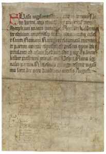 — Suisse, Rarogne (Valais), texte daté 15 août 1526. — Représentation d’un saint nimbé et tonsuré avec un couteau comme symbole (saint Barthélémy ?), d’un style proche des artistes valaisans du XVIe siècle.