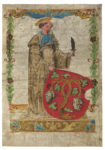 FORT GRANDE ET INTÉRESSANTE MINIATURE FIGURANT UN SAINT EN PIED, LES ARMOIRIES DE LA VILLE DE RAROGNE (VILLE VITICOLE) ET UN TEXTE AU DOS CITANT DES NOTABLES DE LA CITÉ VALAISANNE. CE GRAND FORMAT ATYPIQUE N’EST PAS SANS RAPPELER LES FRESQUES QUI ORNENT LES ÉGLISES DU VALAIS ET LA PEINTURE DANS LE DIOCÈSE DE SION.