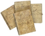 4) Livre concernant l’etat général des journées qui sont dues aux ouvriers, qui travaillent à la maison de la Fin. Le présent livre a été commencé le vingt cinq mars mil huit cent huit. Connu par moi. France, Allier, Thiel-sur-Acolin, 1808-1814, 250 pages environ [201 numérotées] à l’encre brune sur papier bleu. Reliure de plein vélin contrecollé de papier sur les plats. Dimensions : 246 x 183 mm. De la main de l’abbé De La Barre. Joint : une quittance de Pierre Boutin datée de 1672.