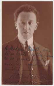 Arthur Rubinstein. 1887-1982. Pianiste polonais, un des plus grands interprètes du répertoire romantique. Photographie avec envoi aut. signé. Bucarest, 10 avril 1927. Sur carte postale in-12.