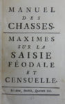 [CODE de la CHASSE]. • Manuel des chasses, ou Dissertation sur le droit de chasse […]. •• Maximes sur la saisie feodale et censuelle […] conformément au Droit commun du Royaume, & particulier des Coutumes de Paris, Tours, Blois &...