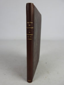 une en couleurs en couverture, d’après Charles de CONDAMY et sept d’après V. BOCCHINO, le tout gravé par Cl. FAIVRE, illustrant les paroles de Léon LACROIX et la musique d’Auguste VALISSANT de cette fanfare composée pour l’équipage Menier. L’ouvrage est dédié à Christiane de Polès, « maîtresse vautour » d’Henri Menier. Tiré à 126 exemplaires dont 125 numérotés, celui-ci, EXEMPLAIRE UNIQUE SUR JAPON contenant CINQ AQUARELLES ORIGINALES par BOCCHINO (maquettes et projets de maquette), trois ou quatre suites supplémentaires de sept ou huit des illustrations, dont DEUX SUR PEAU DE VÉLIN, et la décomposition des couleurs (en douze planches) de l’illustration de la couverture. De la bibliothèque Henri Viellard, avec-exlibris. Thiébaud, 384.