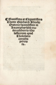 GUICHARD (Thomas) — Oratoris facundissimi in Lucani pharsalia oratio. — S.l.n.d. [au colophon] : Toulouse, Jean de Guerlins, novembre 1519. — In-4 gothique, veau brun, double encadrement de filets à froid, fleuron doré aux angles, dos orné...