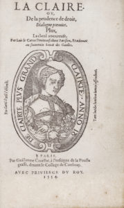 Première œuvre littéraire de l’avocat et poète Louis Le Caron (1534-1613), publiée à Paris à son retour de l’université de Bourges. Elle contient des dialogues sur la philosophie du droit, échangés par l’auteur avec ladite Claire, une vertueuse et savante demoiselle dont il fut épris et qu’il prit pour guide en ses études (cf. Cécile Alduy, Politique des « Amours », Droz, 2007, p. 193 et seq.).
