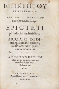 ÉPICTÈTE. [En grec] : Epicteti philosophi enchiridion. Arriani dedictis Epicteti libri quatuor. Salamanque, Juan Canova, 1555. In-8, veau marbré, dos orné, tranches rouges (Reliure du XVIIIe siècle).