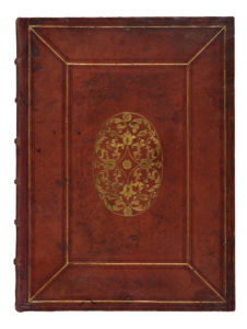 pp.n.ch., maroquin rouge, jeux de filets dorés et à froid formant double encadrement, grand cartouche ovale au centre orné de fleurons et de rinceaux azurés, dos orné, tranches dorées et ciselées (Reliure italienne du XVIIe siècle).