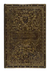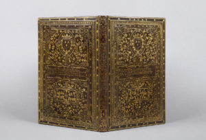 ♦ EXEMPLAIRE DE PRÉSENT, DANS UNE EXTRAORDINAIRE ET TRÈS PRÉCIEUSE « RELIURE ÉPIGRAPHIQUE » DU XVIE SIÈCLE, À DÉCOR DE FEUILLAGES ET D’ENROULEMENTS DE CUIR. Elle porte, dans deux grands cartouches rectangulaires, deux mentions sous forme de quatrains différents pour chaque plat, et en tête sur les deux plats les armoiries du Duc d’Anjou entourées du collier de l’Ordre de Saint Michel.