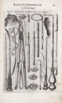 Remarquable illustration gravée sur cuivre, comprenant un titre-frontispice orné de 6 saissantes scènes opératoires, et de 13 planches comprises dans la pagination représentant des écorchés, des instruments de chirurgie, le glossocome et des opérations (celle du bec-de-lièvre et de la suture sèche).