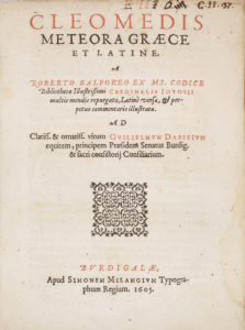La traduction est de Robert Balfour, philosophe et philologue britannique qui composa un traité d’astronomie, publié à la suite du texte de Cléomède, en pagination continue mais avec une page de titre particulière : Commentarius in libros duos Cleomedis, De contemplatione orbium caelestinum. On rappellera les positions scientifiques de Balfour : partisan de Galilée, celui-ci cite à plusieurs reprises Copernic, dont il possédait d’ailleurs un exemplaire de l’originale du De Revolutionibus (1543), aujourd’hui conservé à l’Arsenal.