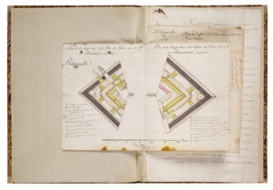 Le manuscrit contient les directives données par Vauban pour la fabrication et l’emploi d’un ciment utilisé à Versailles par Nicolas Le Jongleur, fontainier du Roi. Il est accompagné de 2 planches dessinées en couleurs, avec notes manuscrites, listant des travaux proposés en 1693 dans les fortifications de la ville de Philippeville près de Namur :