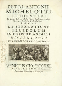 MICHELOTTI (Pietro Antonio). — De separatione fluidorum in corpore animali dissertatio physico-mechanico-medica. — Venise, Héritiers de Pinelli, 1721. — In-4, veau marbré, triple filet à froid, dos orné, pièce de titre rouge, tranches...