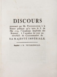 POISSONNIER (Pierre-Isaac). — Discours prononcé à la Séance publique qu’a tenu le 8 de Mai 1759, l’Académie Impériale des Sciences, à l’occasion du jour anniversaire du Couronnement de Sa Majesté Impériale. — Imprimé à St....
