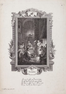 Chaque sujet est placé dans un grand cartouche rocaille et accompagné en dessous d’un quatrain en français.