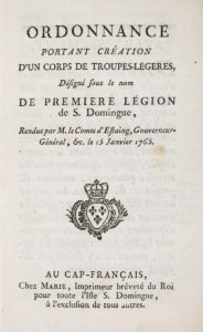 SAINT-DOMINGUE. — Ordonnance portant création d'un corps de troupes-légères, désigné sous le nom de première Légion de S. Domingue. — Au Cap-Français, Marie, s.d. [1765]. — In-8, broché, couverture de papier doré à motifs floraux...