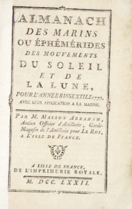 MASSON ABRAHAM (Laurent). — Almanach des Marins ou Éphémérides des mouvements du soleil et de la lune pour l'année bisextile 1772. — Avec leur application à la Marine. — À l'Île de France, De l'Imprimerie royale, 1772. — In-8,...