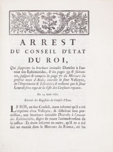 — On joint l’Arrêt du Conseil d'État du 19 août 1775 qui a supprimé cette diatribe, jugée scandaleuse et calomnieuse, contraire au respect dû à la religion et à ses ministres, et interdit Valleyre d’exercer les métiers de libraire et d’imprimeur (plaquette in-4 de 3 pages, cartonnage moderne ; manchettes coupées par le couteau du relieur).