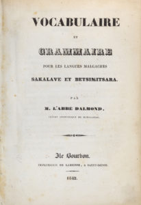 DALMOND (Pierre). — Vocabulaire et grammaire pour les langues malgaches, sakalave et betsimitsara. — Ile Bourbon, Imprimerie de Lahuppe, à Saint-Denis, 1842. — Vocabulaire malgache-français pour les langues sakalave et betsimitsara. —...