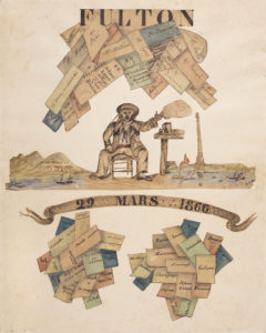 NOUVELLE-CALÉDONIE. — MENU. — Collage original réalisé en souvenir du banquet qui a réuni le 29 mars 1866 les officiers et marins du navire le Fulton. [c. 1866]. — 59 x 47,5 cm. — Transféré sur papier postérieur.