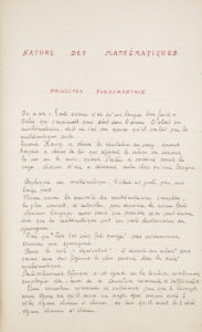 Texte apparemment inédit de Jacques Hadamard (1865-1963), grand mathématicien français qui s’est intéressé à de nombreux domaines du champ des mathématiques : théorie des nombres, analyse mathématique, mécanique, etc. Président de la Société mathématique de France, il succédera à Henri Poincaré à l’Académie des sciences et obtiendra la chaire de mécanique analytique et de mécanique céleste au Collège de France.