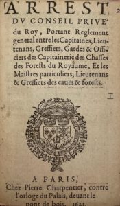 1. Arrest du conseil privé du roy, portant règlement général entre les capitaines, lieutenans, greffiers, gardes & officiers des capitaineries des chasses des forests du royaume, et les maistres particuliers, lieutenans & greffiers des eauës & forests.