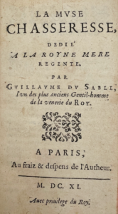 Paris, l’auteur, 28 mars 1661. In-16, 7,5 x 13,5 cm, 6 ff., 60 ff., 168 pp. (chiffrées 61-[228]), veau fauve, triple filet doré en encadrement sur les plats, dos à nerfs orné de motifs dorés, double filet doré aux coupes, roulette intérieure dorée, tranches dorées (Petit, succr de Simier). Édition originale.