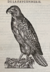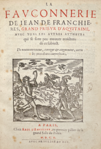 Paris, Abel l’Angelier, 1602. In-4, 15 x 20,5 cm, 4 ff., 127 ff., 5 ff., vélin ivoire, dos lisse (reliure du XIXe siècle). Jolie édition, publiée à la suite de celle de Du Fouilloux, contenant aussi les traités de fauconnerie de Guillaume Tardif, d’Arthelouche de Alagona et de Guillaume Bouchet. Illustré d’un bois sur le titre et de 30 figures d’oiseaux, certaines répétées.