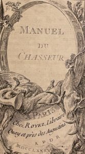 Paris, Royez, 1785. In-12, 9 x 15 cm, 4 ff., 208 + 40 pp., basane fauve, dos orné de faux-nerfs dorés (reliure de l’époque). Édition originale de l’Almanach du chasseur… publié en 1773 et remis en vente avec un titre-frontispice renouvelé. Avec 55 partitions gravées de fanfares.