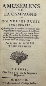 LIGER (Louis) — Amusemens de la campagne ou Nouvelles ruses innocentes, qui enseignent la manière de prendre aux pièges toutes sortes d’oiseaux et de bêtes à quatre pieds ; avec les plus beaux secrets de la pêche dan