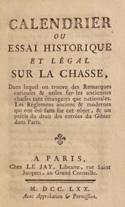 [MARCHAND (Jean-Henri)] — Calendrier, ou Essai historique et légal sur la chasse…