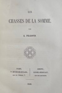 Paris, vve Bouchard-Huzard & Amiens, Leoel-Herouart, 1858. In-8, 15,5 x 23,5 cm, 2 ff., 130 pp., une carte, demi-chagrin vert, fer cynégétique doré au centre du premier plat, dos à nerfs orné de caissons dorés (reliure de la fin du XIXe siècle). Édition originale tirée à 300 exemplaires.