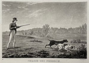 Paris, Audot, vers 1822. In-12 oblong, 21,5 x 14 cm, 18 pl. dont une repliée, demi-veau fauve moderne, non rogné, couvertures (reliure moderne). Rare suite des superbes planches à la manière noire de Susemihl ayant servi à illustrer le Traité général des chasses à courre et à tir de Jourdain (« Un des livres de chasse les plus agréablement illustrés de cette époque » selon Thiébaud) et le Traité des chasses aux pièges de Kresz.