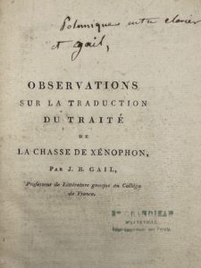 [XÉNOPHON].— — [Étienne CLAVIER]. Observations sur la traduction du Traité de la chasse de Xénophon par J.-B. Gail…— [Sur la] réponse de J. B. Gail à la critique de son Traité de la chasse.— Nouvelles observations c