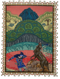 Paris, Ferroud, 10 janvier 1927. In-12, 13 x 19 cm, 1 f. blanc, 2 ff., 72 pp., 1 f., 1 f. blanc, demi-maroquin bleu avec coins, dos à nerfs orné d’un motif cynégétique sur une pièce mosaïquée de maroquin orange, tête dorée, non rogné (Ch. Septier). Charmante édition illustrée en couleurs par Maurice Lalau.